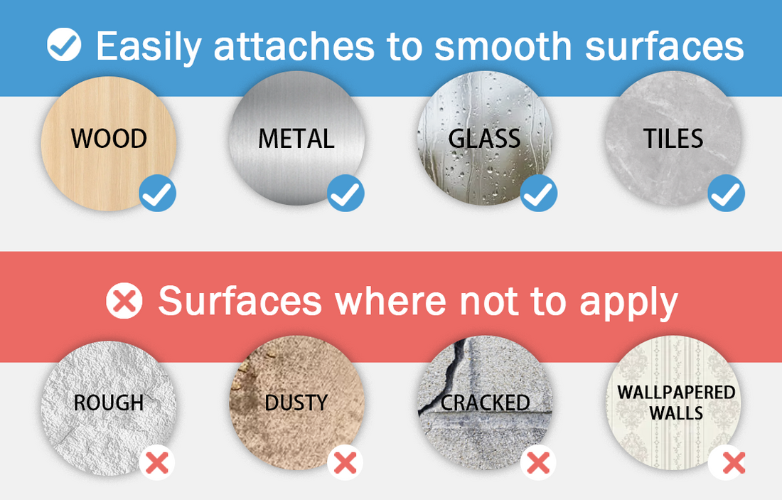 Stick only to metal, glass, tile, wood, or plastic. Avoid painted walls—removal may damage the surface. To peel off safely, spray water or use a hair dryer to soften the adhesive.